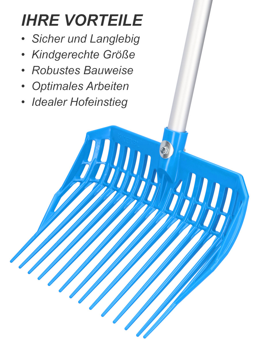 Die Kinder-Dunggabel EcoFork Mini ermöglicht es kleinen Hofhelfern ab 5 Jahren, spielerisch und sicher bei der täglichen Arbeit mitzuwirken. In kindgerechter Größe und mit attraktivem Design ist sie speziell auf die Bedürfnisse junger Anwender abgestimmt. So wird aus Helfen ein echtes Erlebnis mit Spaß, Bewegung und Verantwortungsgefühl.