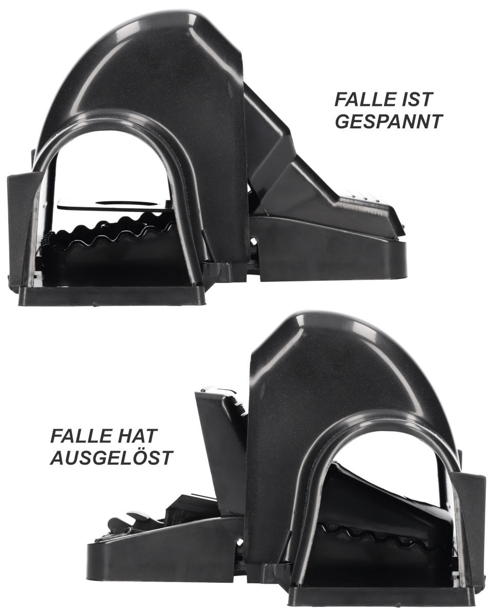 Die Fallen sind als beidseitig begehbare Durchlauffallen konzipiert. Ratten können von beiden Seiten in die Falle laufen, was die Fangquote deutlich erhöht. Sobald das Tier den Köder berührt, löst die kräftige Schlagmechanik zuverlässig aus. Das geschlossene, robuste Kunststoffgehäuse schützt dabei nicht nur die Mechanik, sondern minimiert auch das Risiko für Haustiere und Menschen.