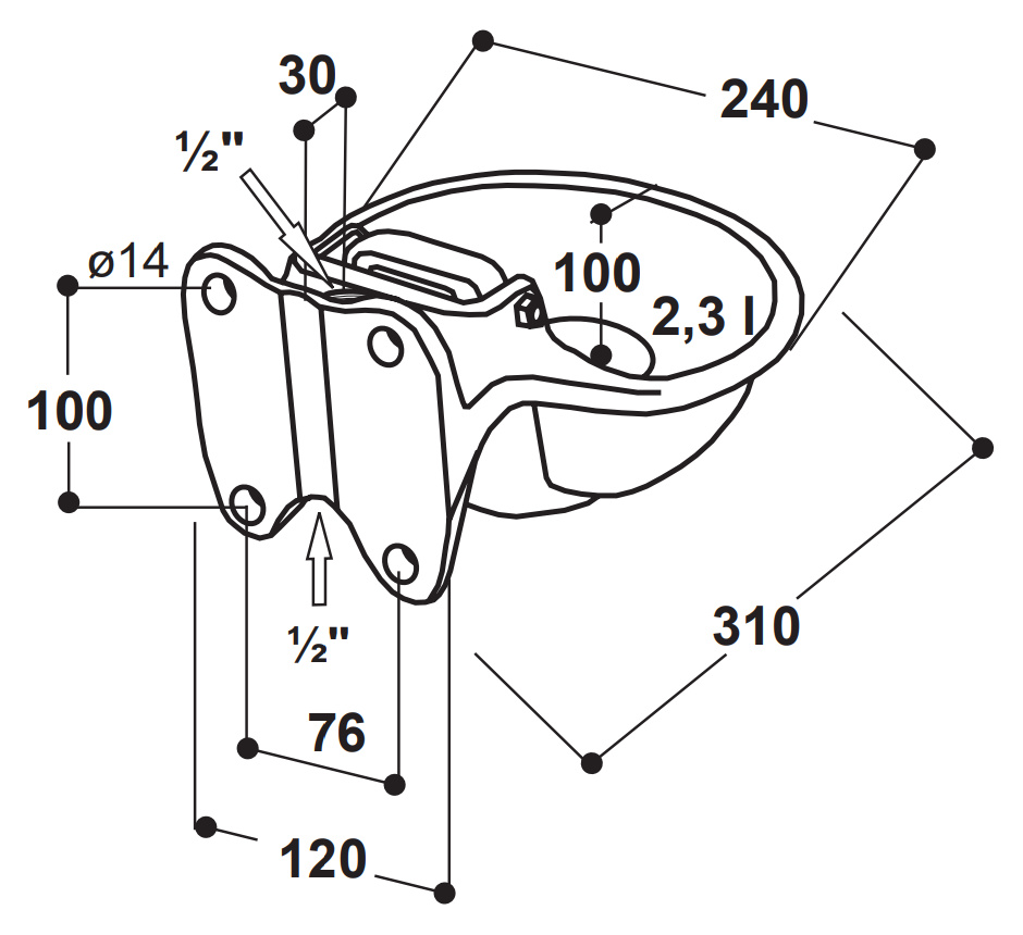 Das Tränkebecken Mod. 115 verfügt über eine große Tränkeschale aus Gusseisen, die vollständig emailliert ist. sowie über einen hohen Wasserzulauf von bis zu 14 l/min. Die Druckzunge aus Gusseisen ist für Rinder und Pferde leicht zu betätigen. Die Moment-Wasserregulierung sorgt für eine einfache und werkzeuglose Wassermengenregulierung unter der Zunge. Zur Regulierung wird die Zunge angehoben und durch Drehen an der Regulierschraube der Wassernachlauf eingestellt oder auch ganz abgestellt. Die abgerundeten Ecken und Kanten verhindern Verletzungen. Die Montage kann mit der 4-Loch Befestigung an Wänden und Rohren erfolgen. Der Wasseranschluss ist sowohl obel als auch unten möglich. Die Tränke ist für einen maximalen Wasaserdruck von 5 bar ausgelegt.