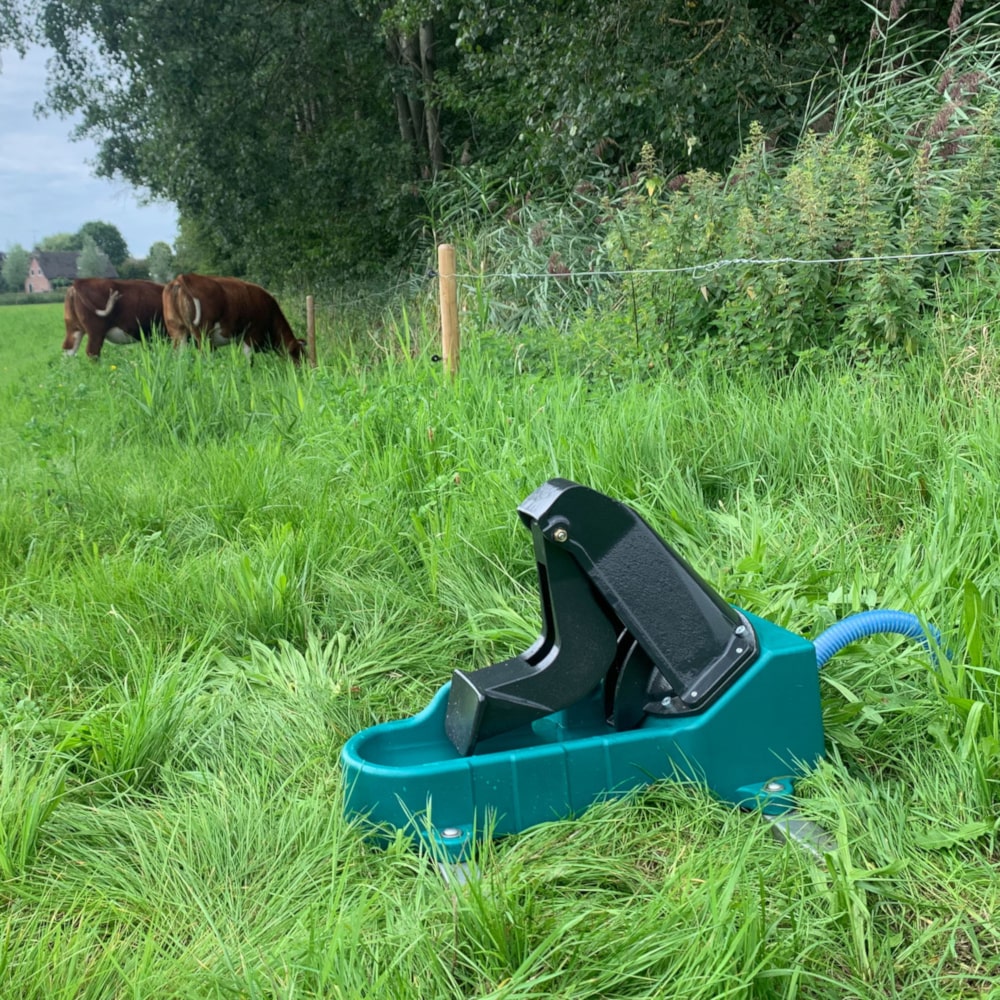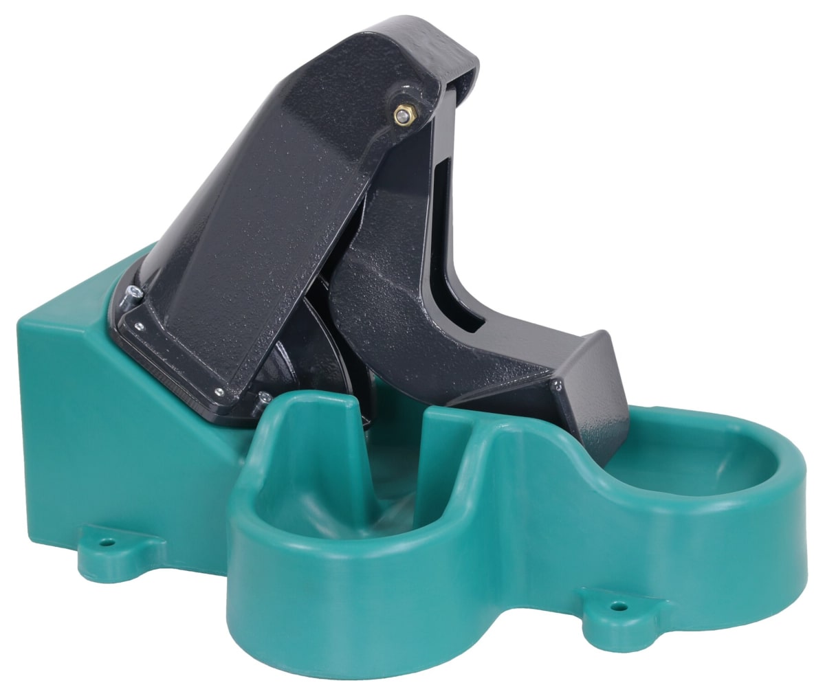 Die Suevie Membran-Weidepumpe ist sehr leichtgängig, sodass die Betätigung von den Tieren schnell erlernt wird. Die Tiere können so eingenständig das Wasser z.B. aus einem vorhandenen Brunnen oder aus Oberflächengewässern fördern und versorgen sich so stets selbst mit frischem Wasser. Die Weidepumpe verfügt über eine Schale aus stabilem und UV-beständigem Polyethylen und einen Betätigungshebel aus hochwertigem und kunststoffbeschichtetem Gusseisen. Zusätzlich besitzt das Mod. 548 JUNIOR eine seitliche Tränkschale, aus der Jungtiere, die die Betätigung der Pumpe noch nicht erlernt haben, durch das Muttertier mit Wasser versorgt werden. Dank der verbauten Qualitäts-Membrane wird eine Saugtiefe von bis zu 7m und eine Fördermenge von bis zu 0,4 Liter pro Hub erreicht. Eine Weidepumpe ist zur Versorgung von 15-20 Tieren geeignet.